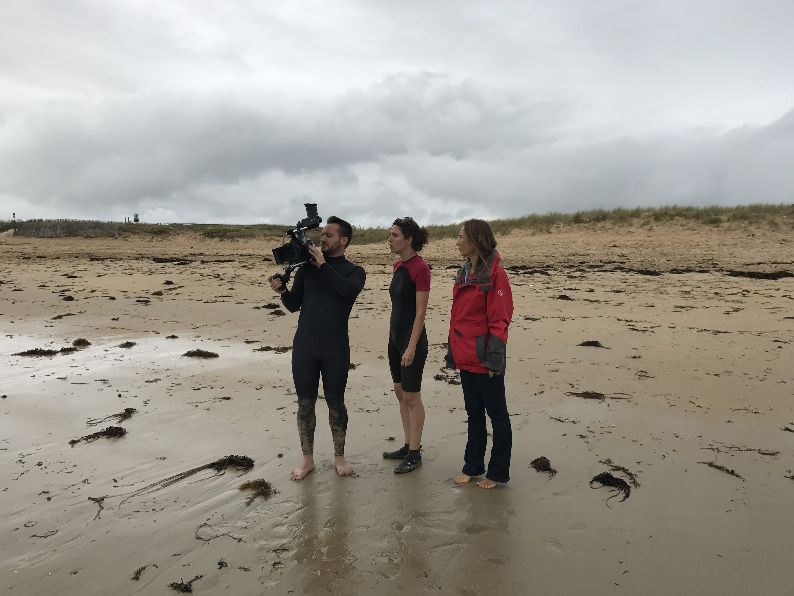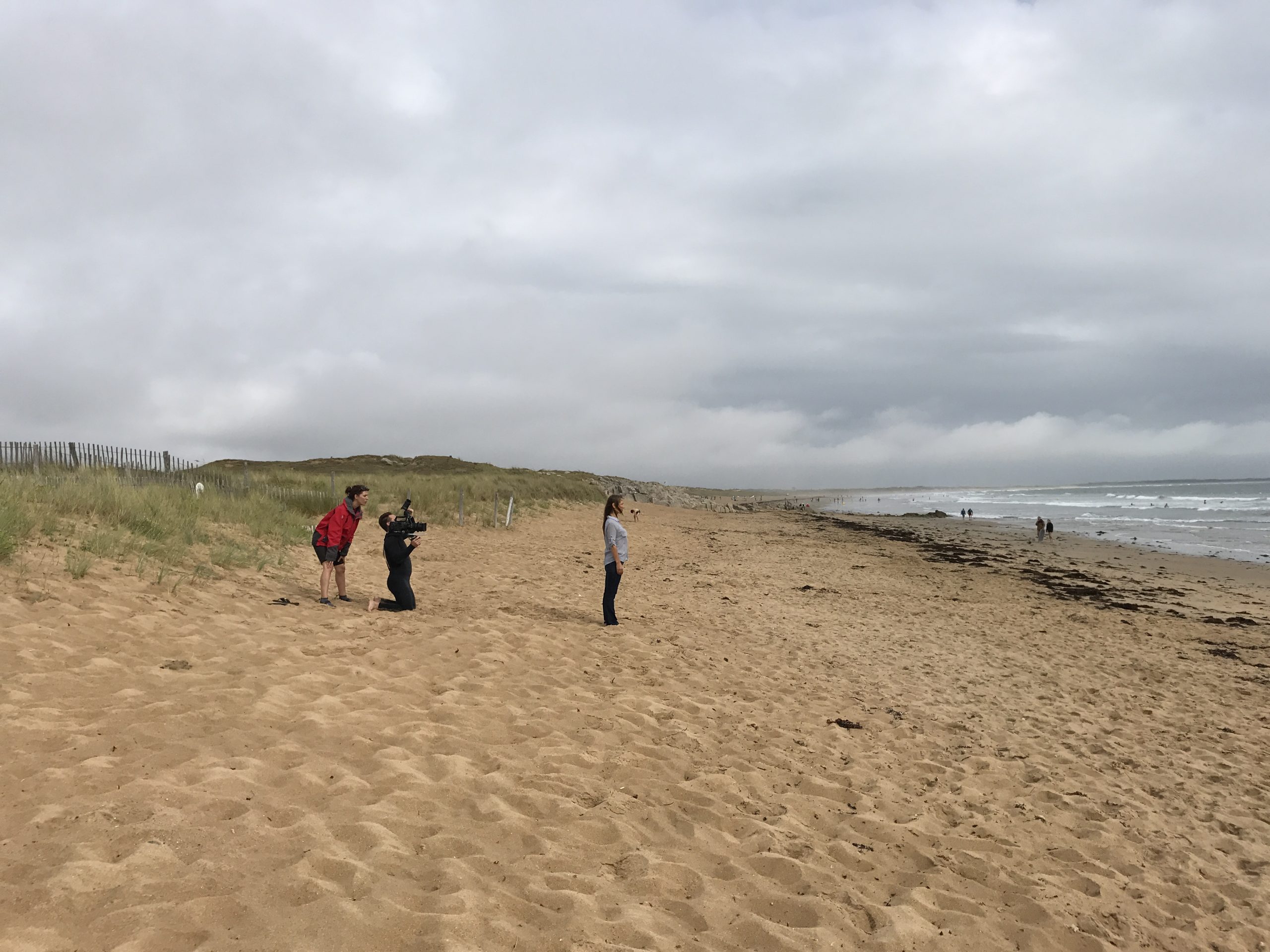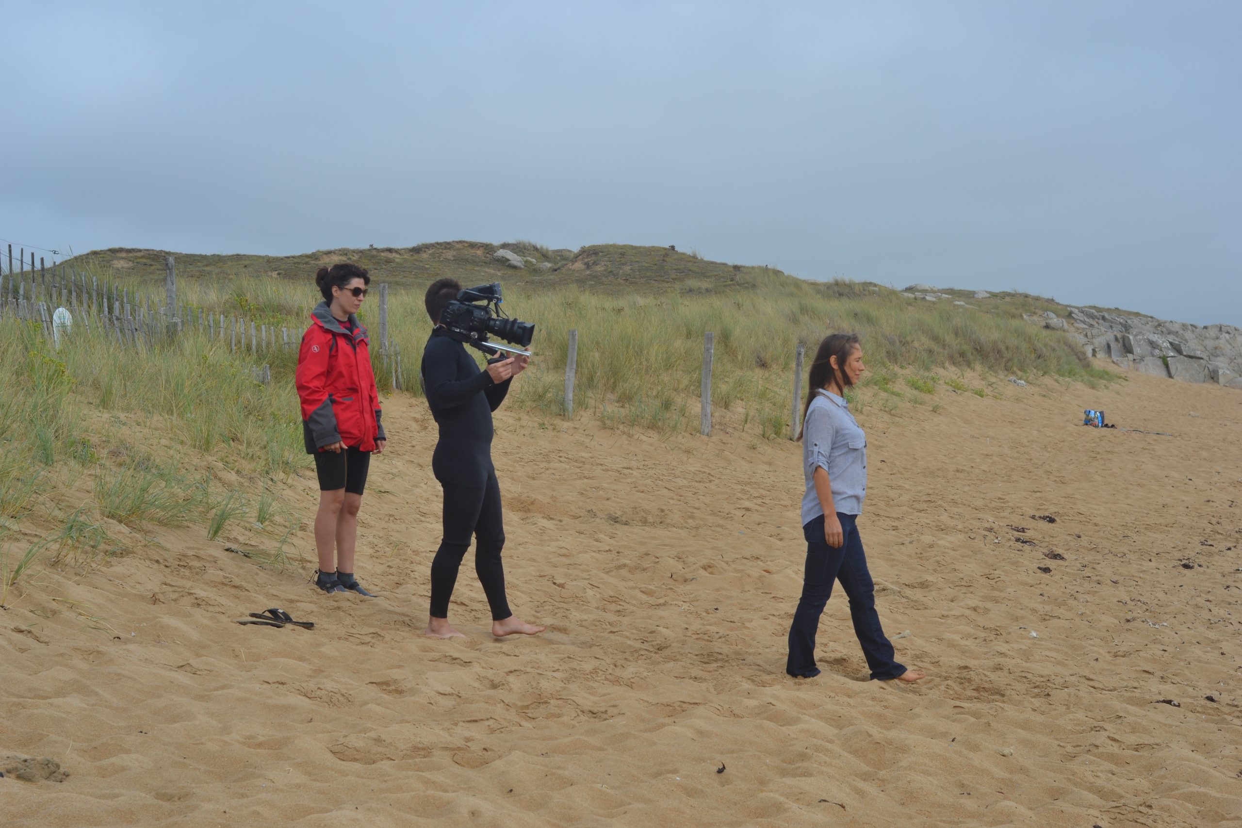 Le tournage a eu lieu en plein mois d’août. Nous dormions à La Trinité-sur-Mer, chez mon ami Fabien, régisseur pour l’occasion et auteur de ces jolies photos de tournage… Nous voilà sur le « plateau » de sable, la réalisatrice Sahra Daugreilh, le topissime chef opérateur Nicolas Berteyac, Fabien donc, et moi-même ! Il s’agissait en premier lieu que la caméra confiée par Nicolas Therry (que je remercie…) revienne vivante du tournage, contre sable et marée…  Une grande serviette bleue comme paravent et voici Nicolas opérationnel. Plans sur les dunes (comme je les ai aime ces dunes… et leurs herbes folles d’un vert si éclatant au naturel), plans les pieds dans l’eau, puis jusqu’à la taille tout habillée, en jean et chemisier bleu, puis je plonge sans sourciller (15 degrés), puis ce seront des dizaines de prises sous l’eau, comme un jeu…  jusqu’à ressortir de la mer en haut rouge à pois blancs et jupe indienne !! Magique. La fantaisie, la poésie de Sahra.