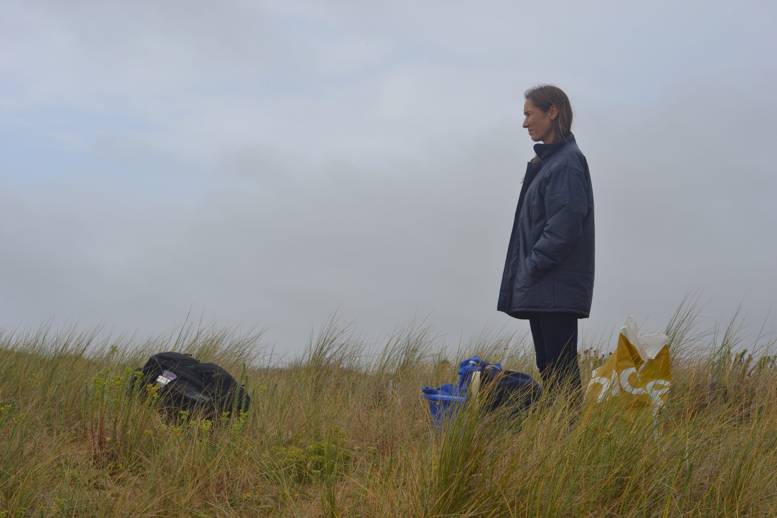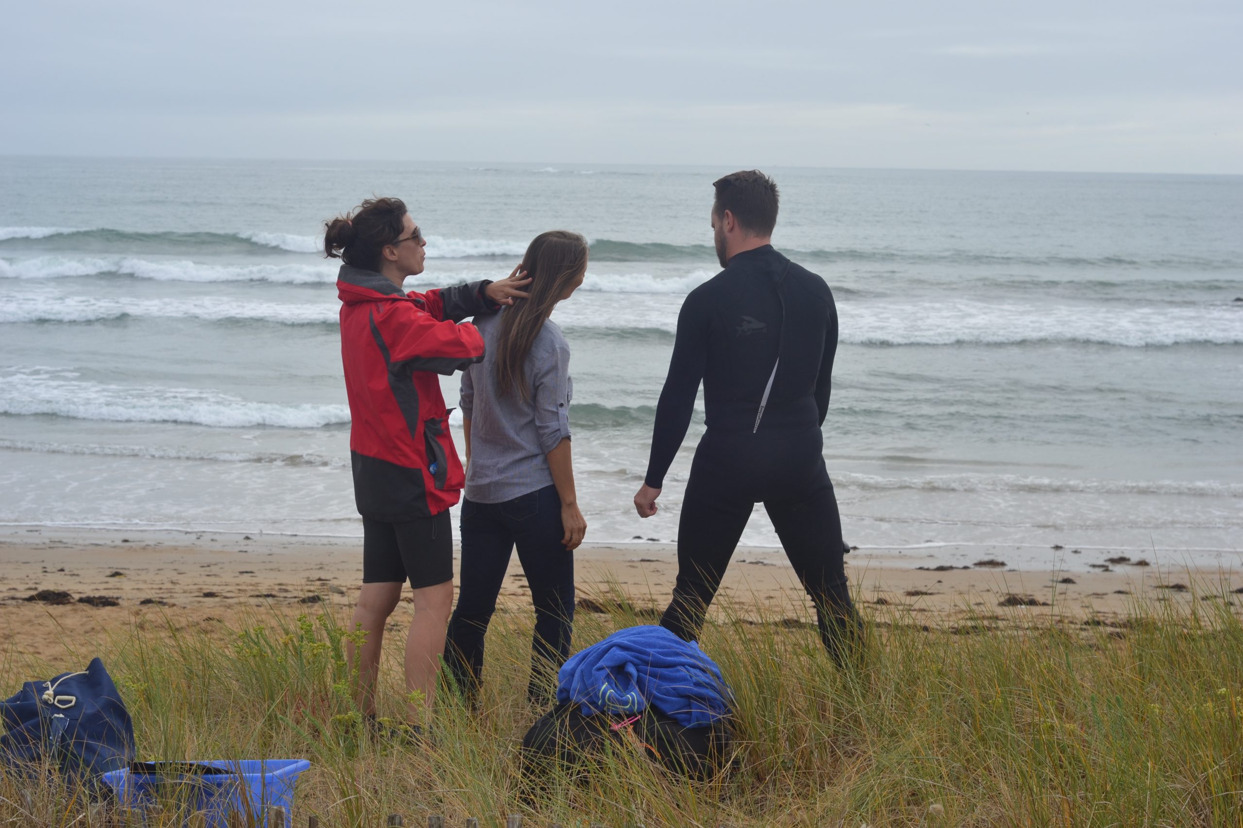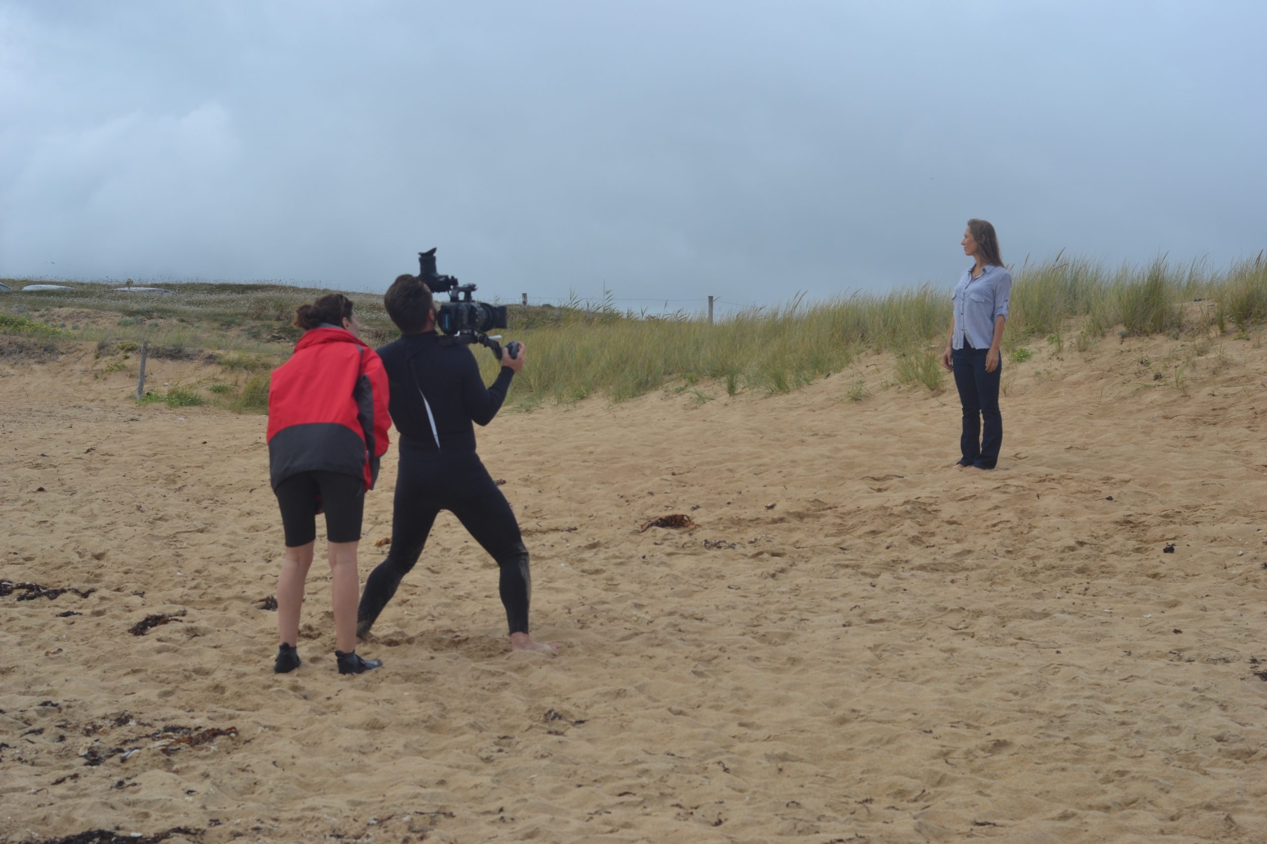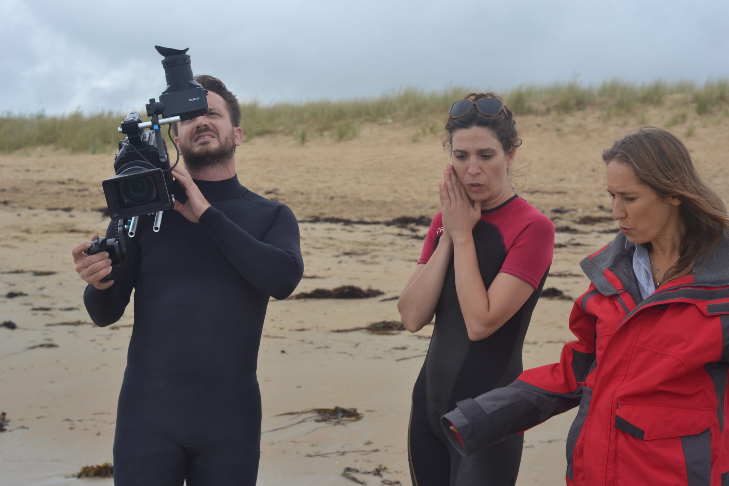 Le tournage a eu lieu en plein mois d’août. Nous dormions à La Trinité-sur-Mer, chez mon ami Fabien, régisseur pour l’occasion et auteur de ces jolies photos de tournage… Nous voilà sur le « plateau » de sable, la réalisatrice Sahra Daugreilh, le topissime chef opérateur Nicolas Berteyac, Fabien donc, et moi-même ! Il s’agissait en premier lieu que la caméra confiée par Nicolas Therry (que je remercie…) revienne vivante du tournage, contre sable et marée…  Une grande serviette bleue comme paravent et voici Nicolas opérationnel. Plans sur les dunes (comme je les ai aime ces dunes… et leurs herbes folles d’un vert si éclatant au naturel), plans les pieds dans l’eau, puis jusqu’à la taille tout habillée, en jean et chemisier bleu, puis je plonge sans sourciller (15 degrés), puis ce seront des dizaines de prises sous l’eau, comme un jeu…  jusqu’à ressortir de la mer en haut rouge à pois blancs et jupe indienne !! Magique. La fantaisie, la poésie de Sahra.