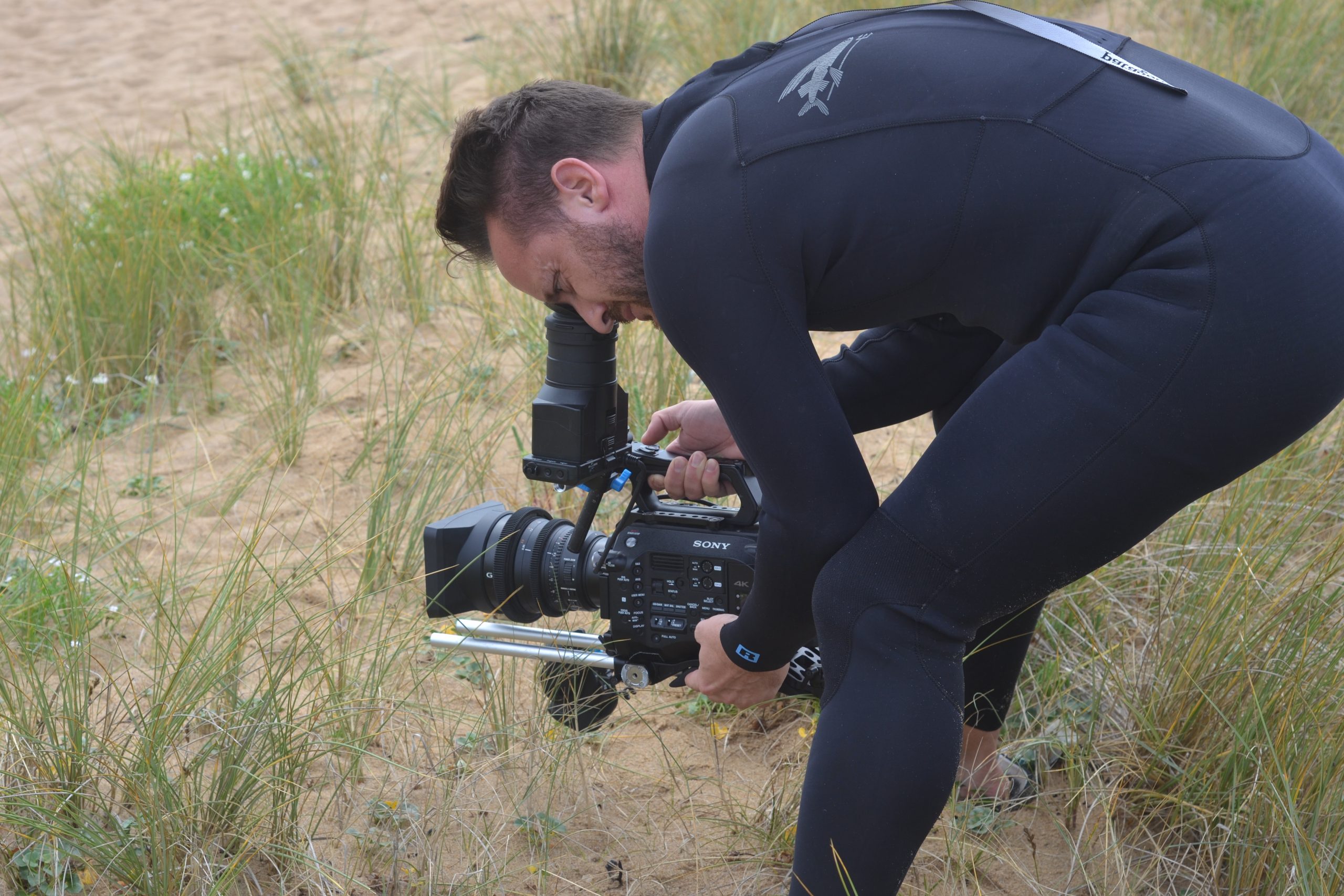 Le tournage a eu lieu en plein mois d’août. Nous dormions à La Trinité-sur-Mer, chez mon ami Fabien, régisseur pour l’occasion et auteur de ces jolies photos de tournage… Nous voilà sur le « plateau » de sable, la réalisatrice Sahra Daugreilh, le topissime chef opérateur Nicolas Berteyac, Fabien donc, et moi-même ! Il s’agissait en premier lieu que la caméra confiée par Nicolas Therry (que je remercie…) revienne vivante du tournage, contre sable et marée… Une grande serviette bleue comme paravent et voici Nicolas opérationnel. Plans sur les dunes (comme je les ai aime ces dunes… et leurs herbes folles d’un vert si éclatant au naturel), plans les pieds dans l’eau, puis jusqu’à la taille tout habillée, en jean et chemisier bleu, puis je plonge sans sourciller (15 degrés), puis ce seront des dizaines de prises sous l’eau, comme un jeu… jusqu’à ressortir de la mer en haut rouge à pois blancs et jupe indienne !! Magique. La fantaisie, la poésie de Sahra.