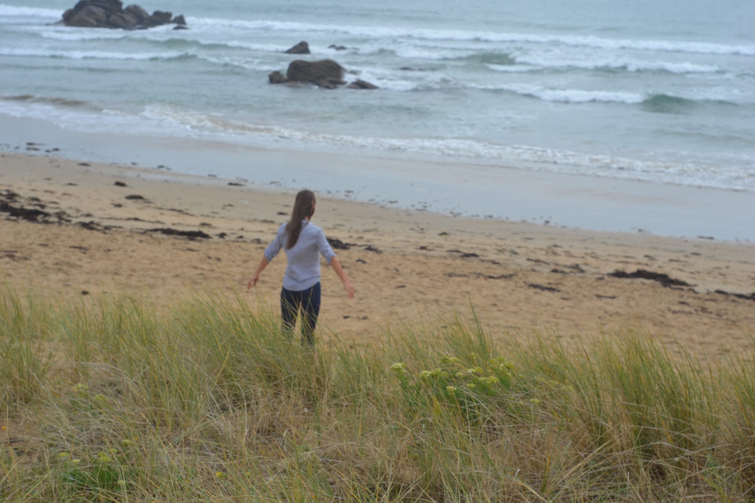 Oh comme il faisait froid, mais oh comme c’était bon, comme c’était beau !! Par hasard, si le hasard existe, Sahra m’a emmenée sur le plage de mon enfance, dans le Morbihan, à Erdeven exactement… Ma joie d’être là où j’ai fait des châteaux de sable, nagé à toutes saisons ou presque, où adolescente je me promenais en talons, et bas résilles (moquée – à raison – par mon cher oncle Jean-Michel !!), tant de souvenirs précieux, ici, précisément…