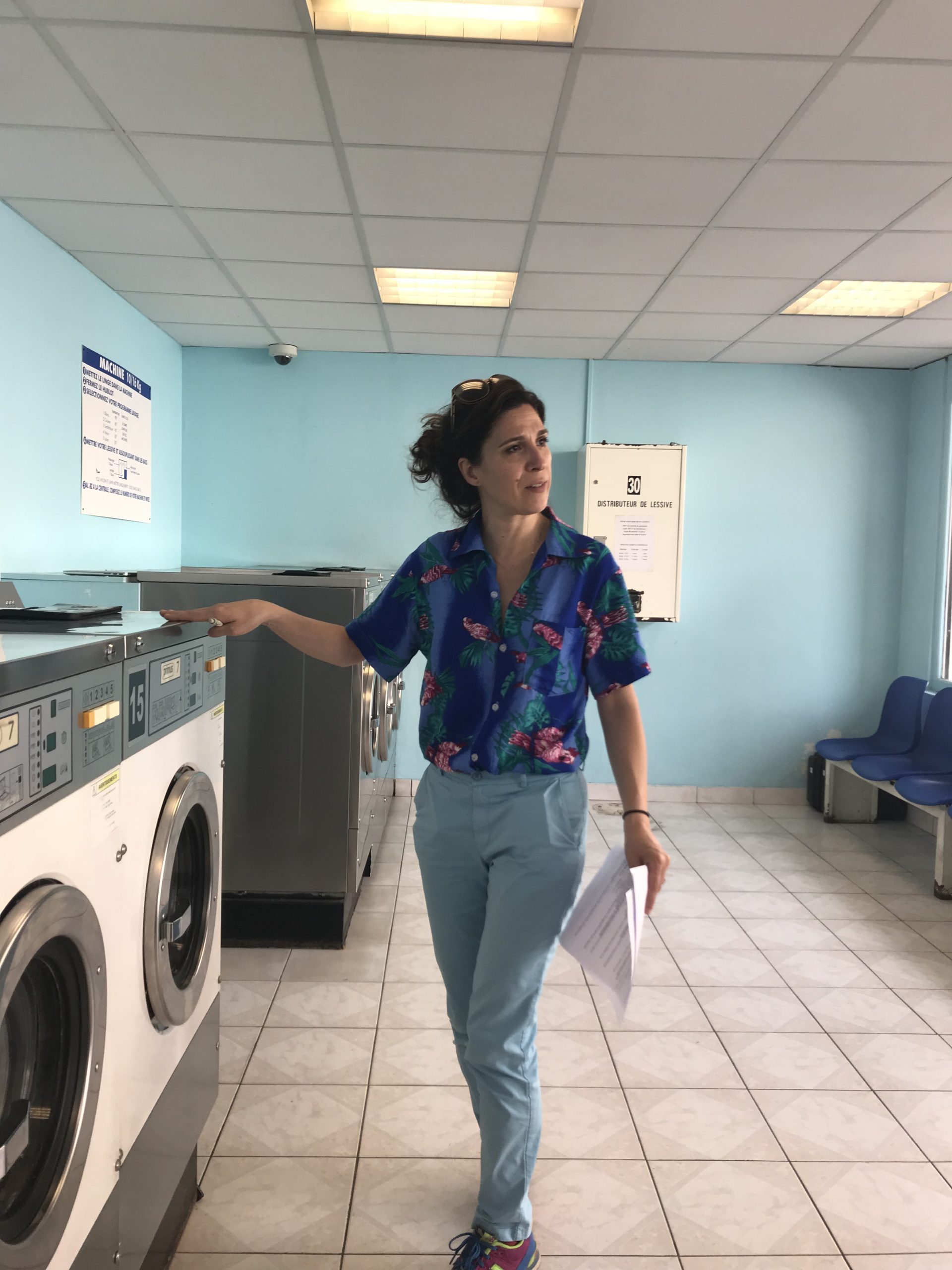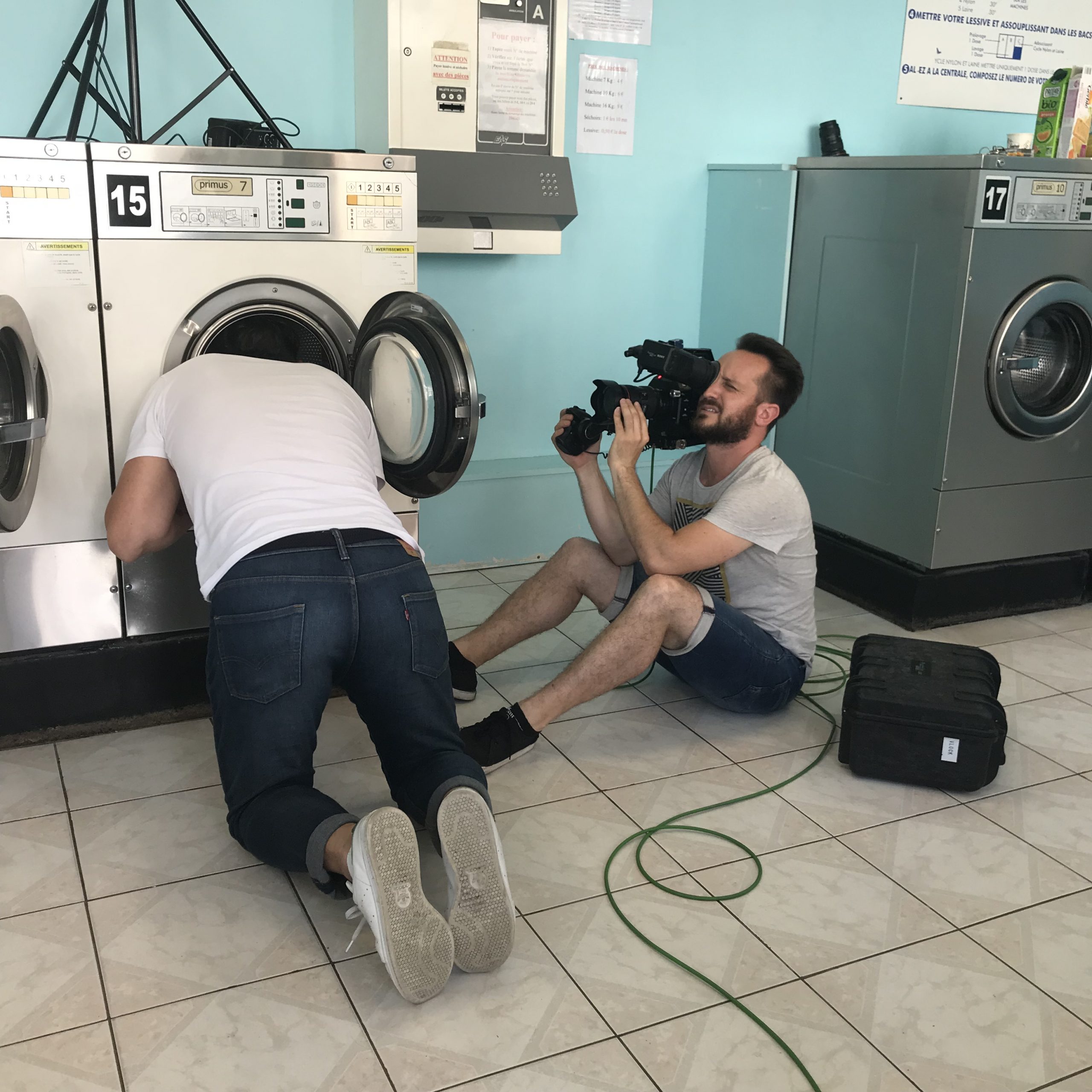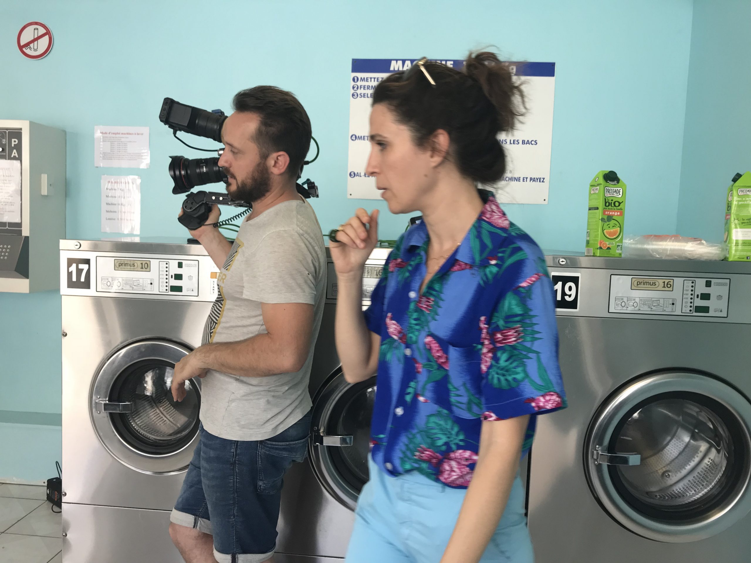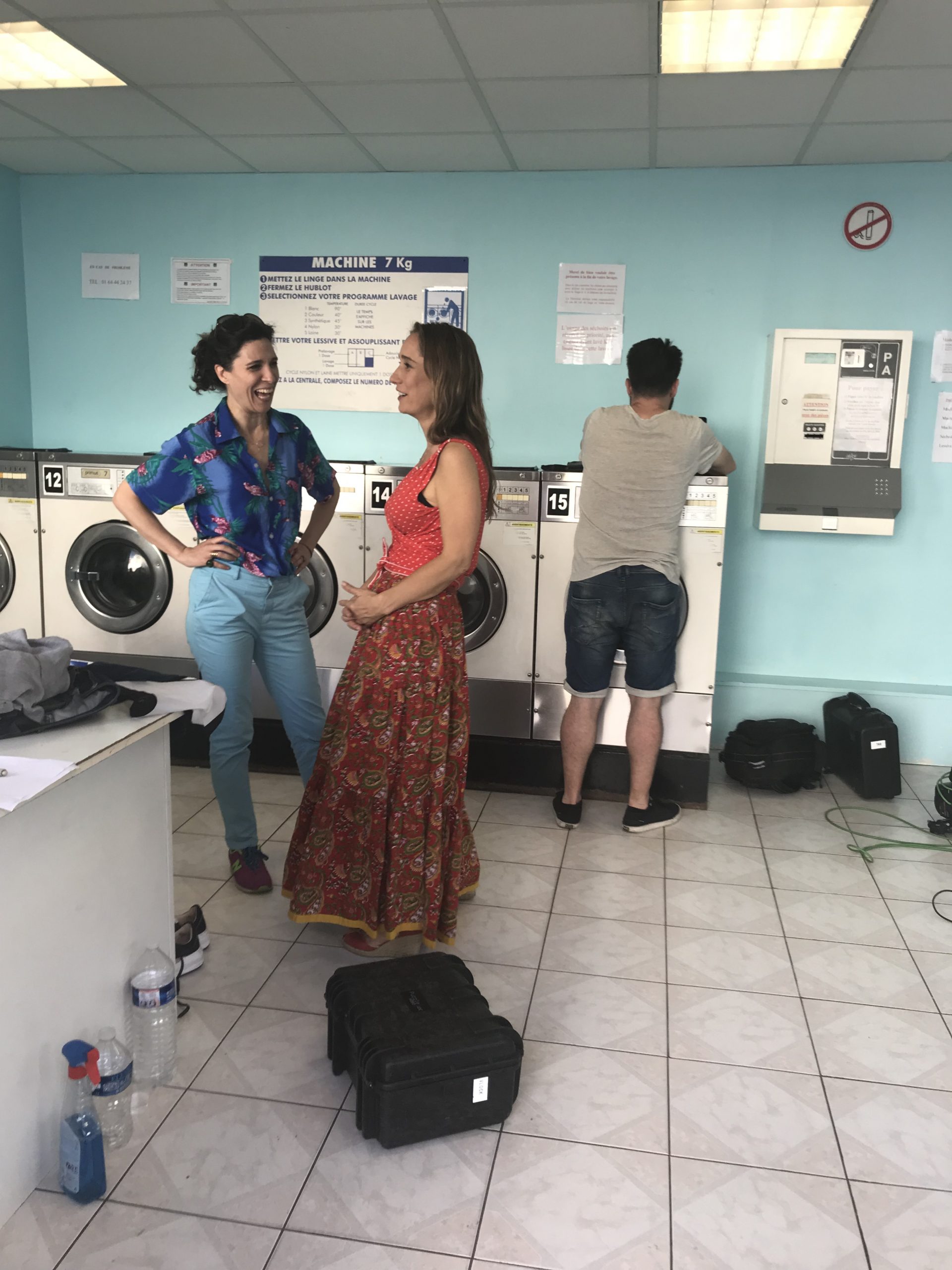 Deuxième partie de tournage ! Direction Villejuif. Banlieue parisienne. Sahra avait repéré un lovomatic qui lui plaisait. Les murs bleus turquoise, les sièges bleu roi, tous ces tambours qu’elle avait pour idée de faire tourner au même moment… On sèche on plie on range, mais avant il faut laver !!