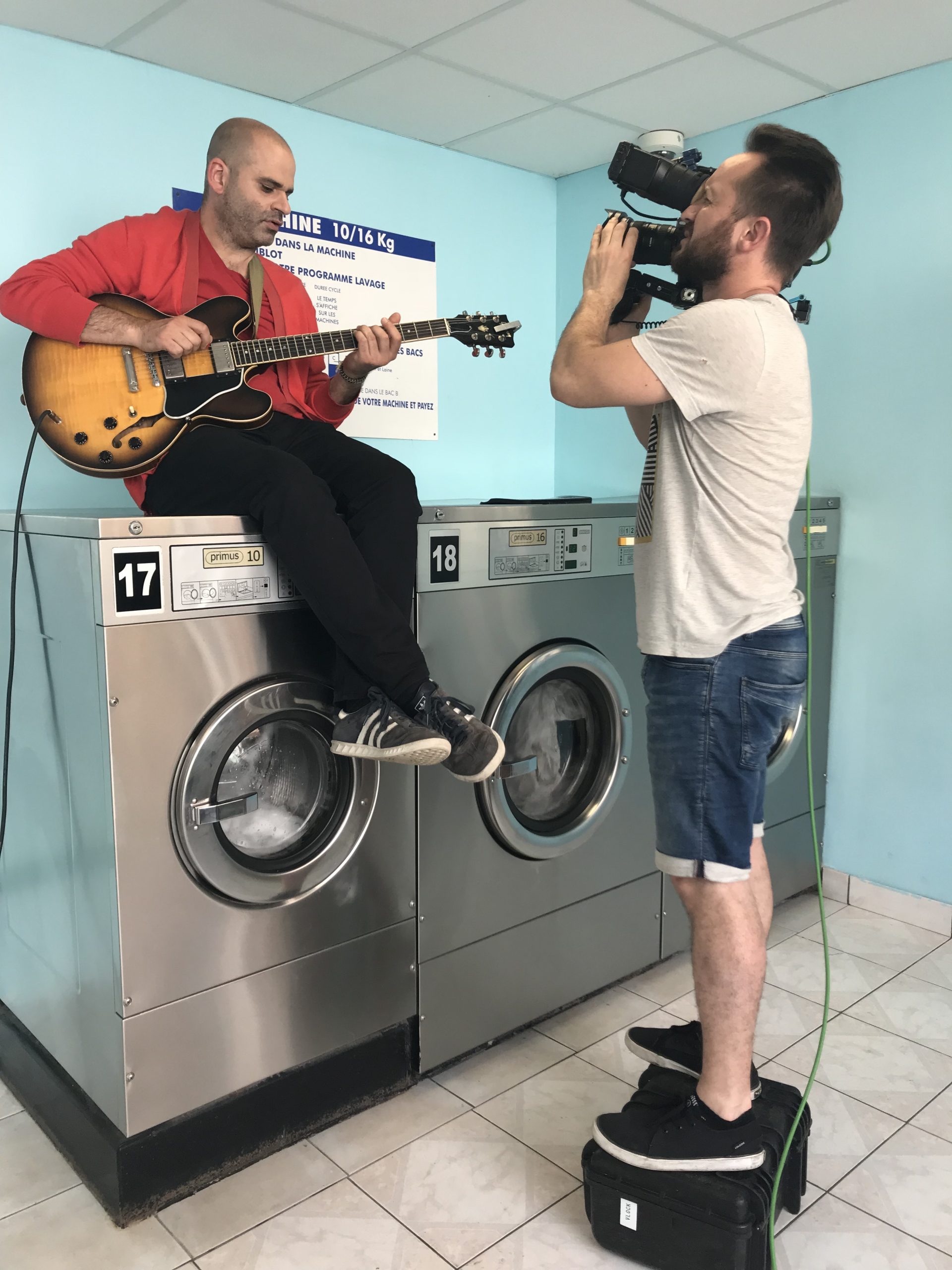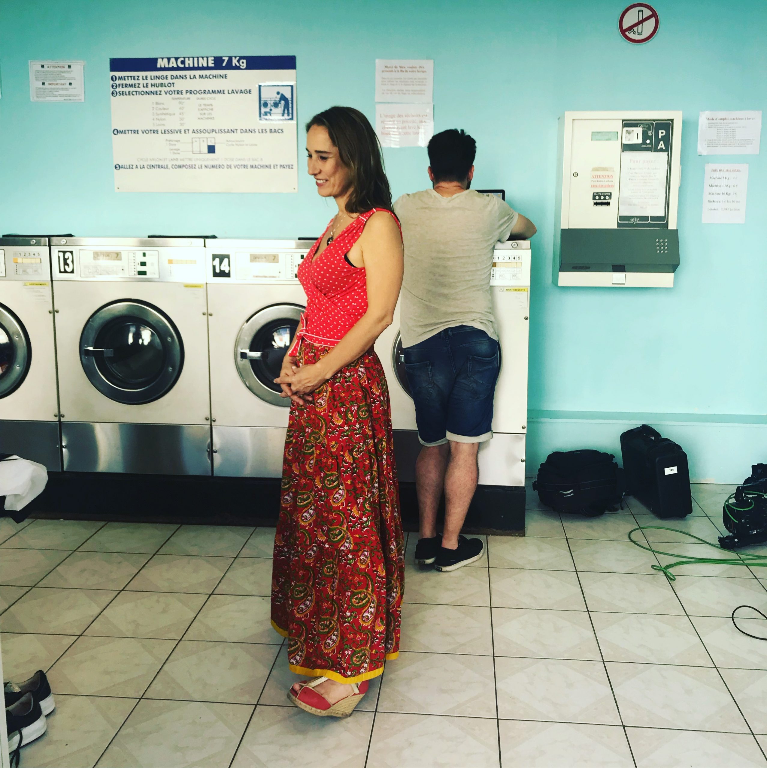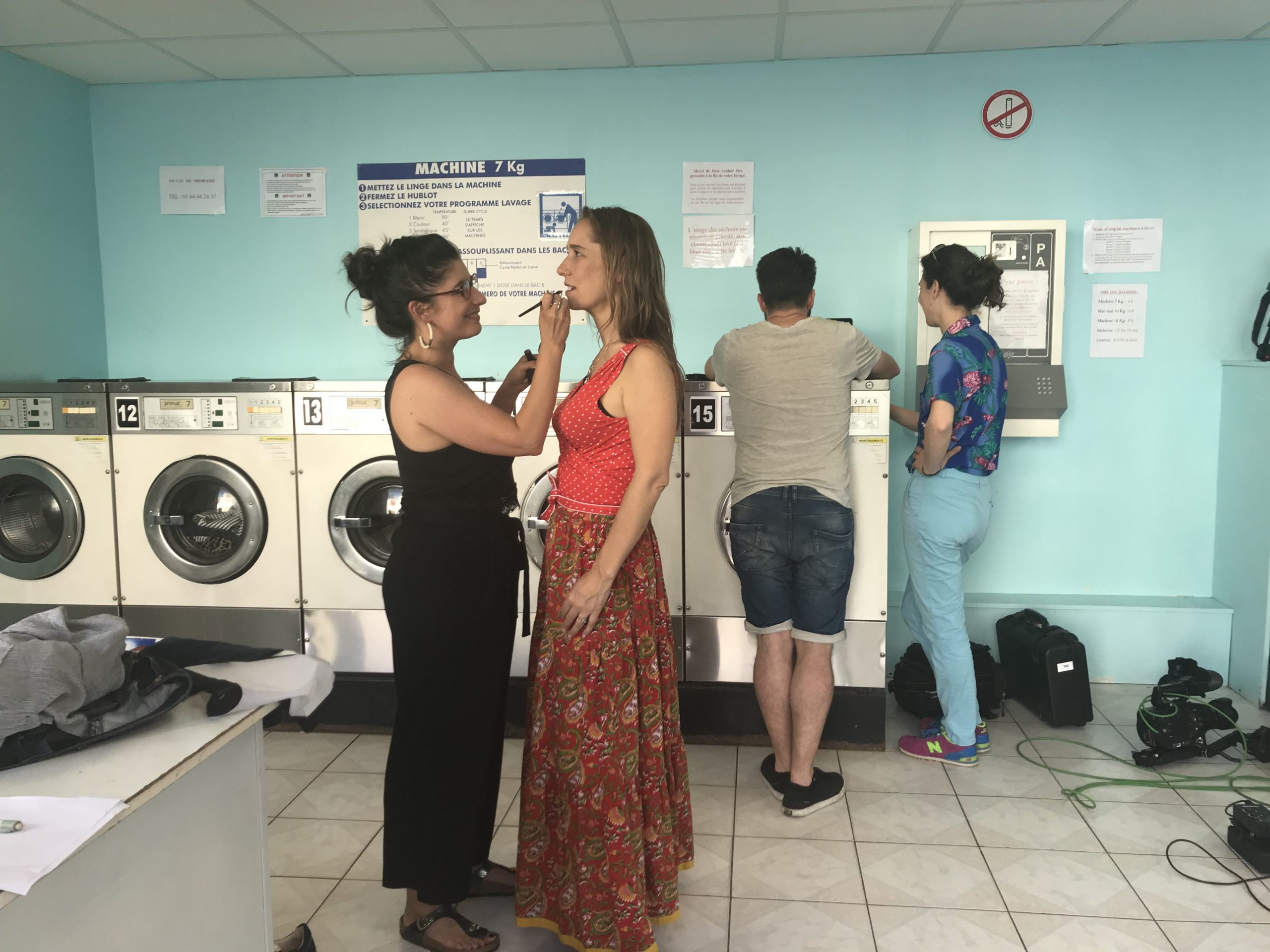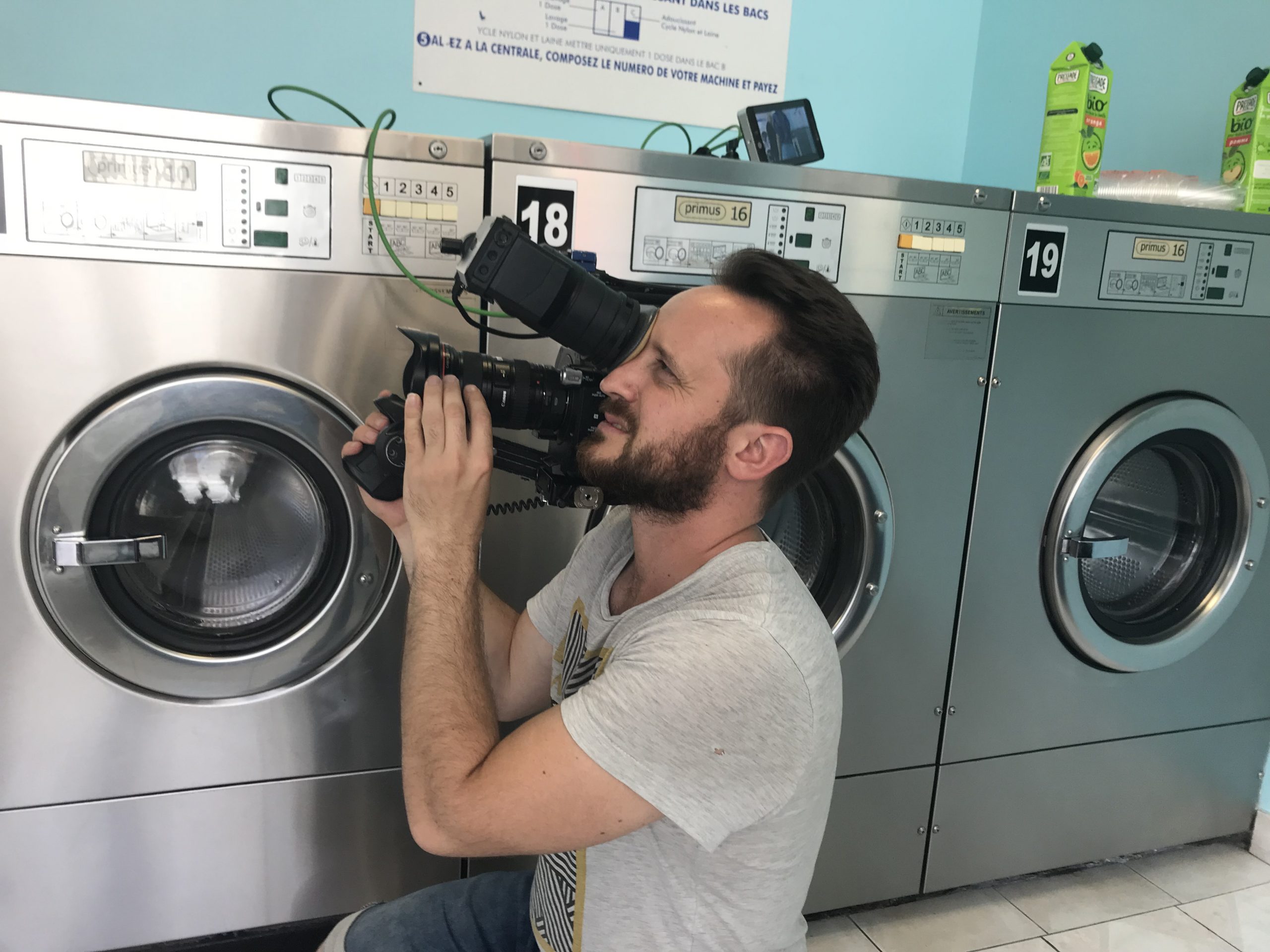 Deuxième partie de tournage ! Direction Villejuif. Banlieue parisienne. Sahra avait repéré un lovomatic qui lui plaisait. Les murs bleus turquoise, les sièges bleu roi, tous ces tambours qu’elle avait pour idée de faire tourner au même moment… On sèche on plie on range, mais avant il faut laver !!