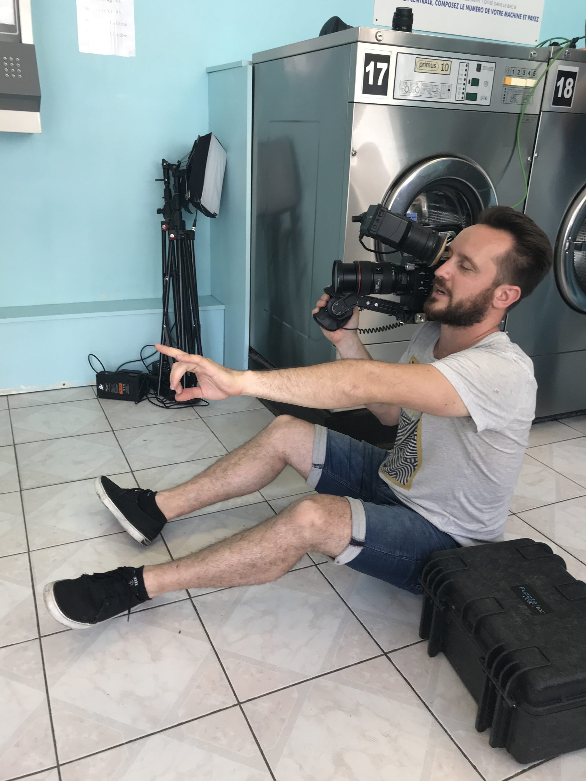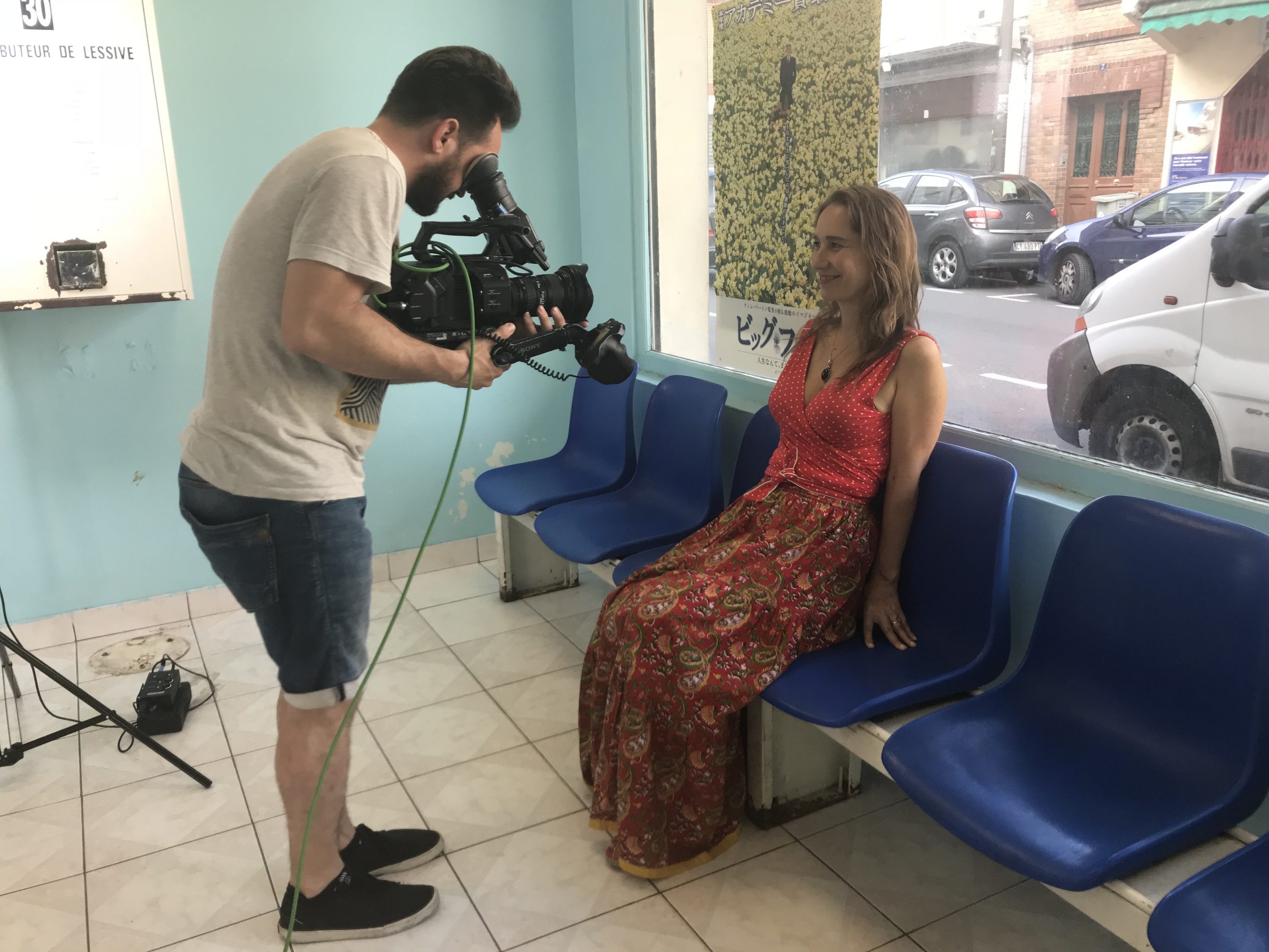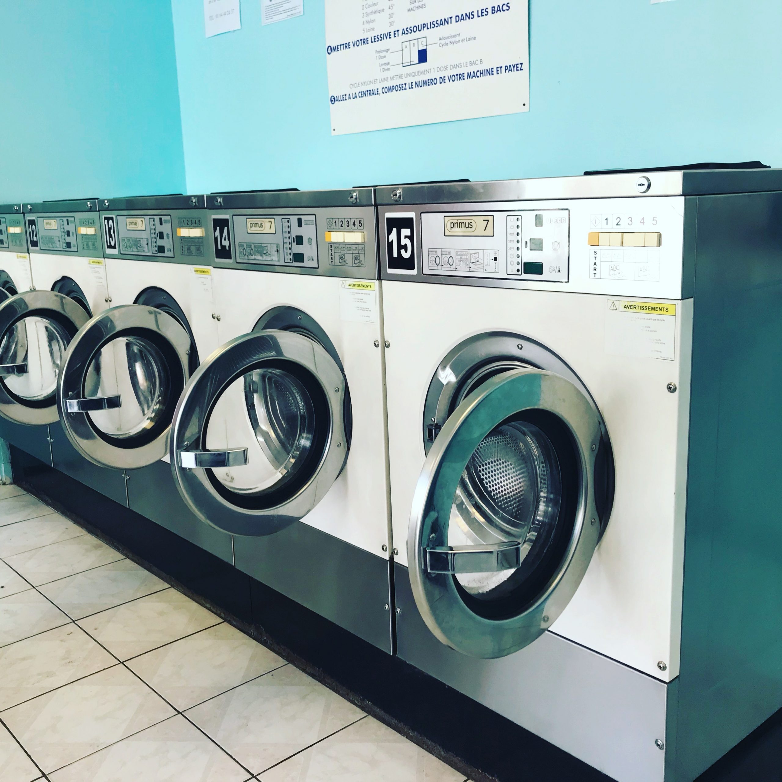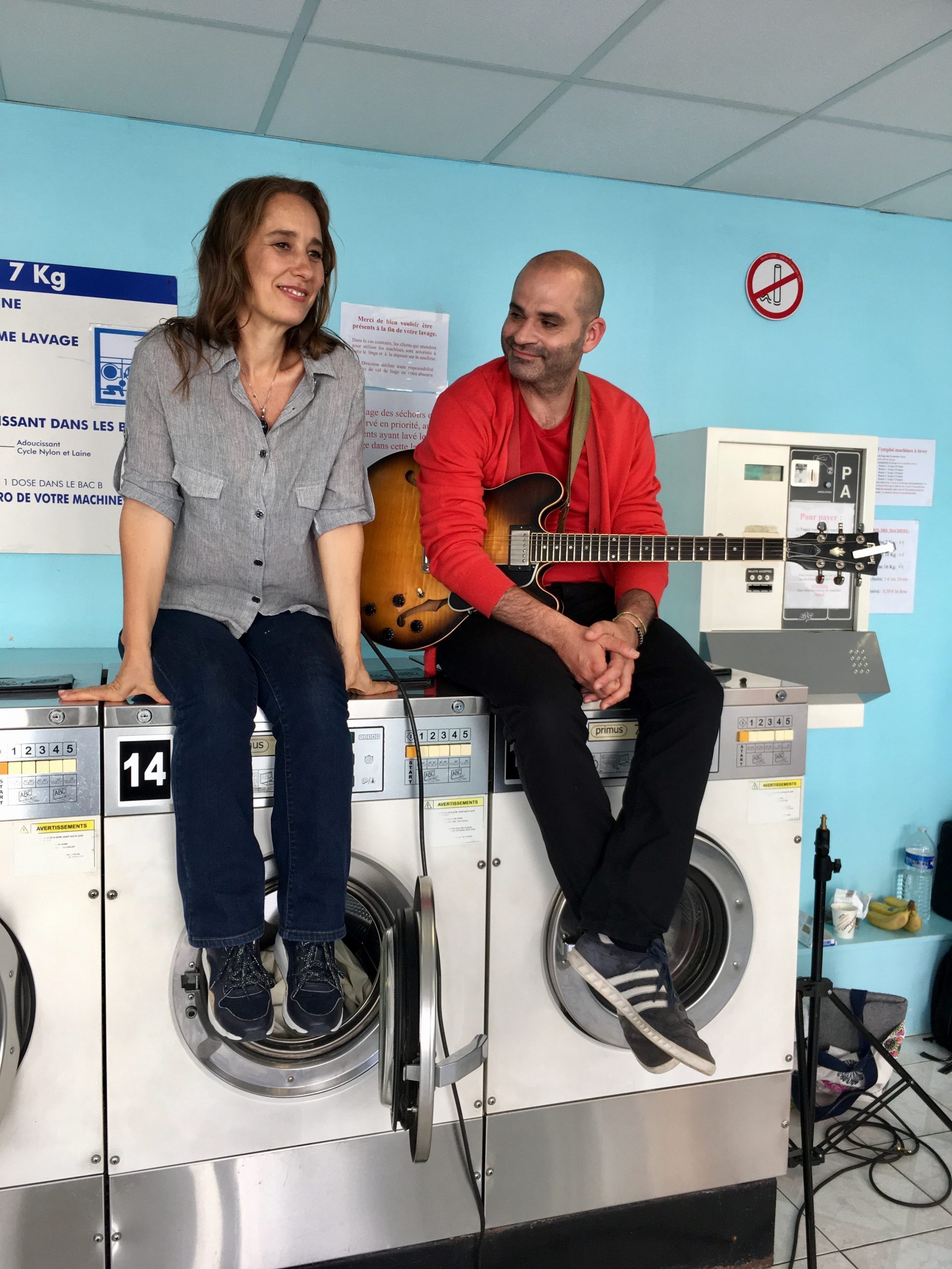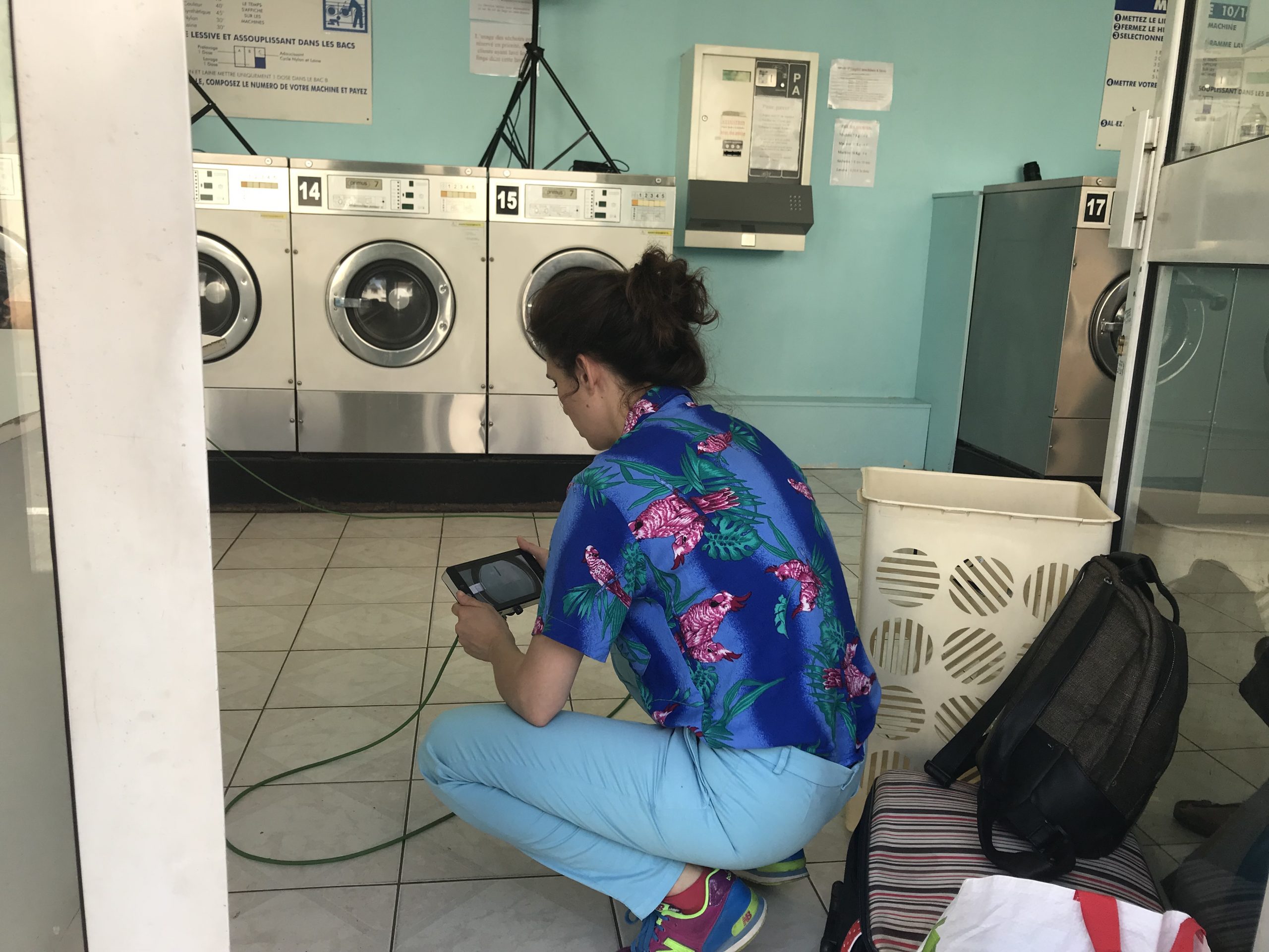 Deuxième partie de tournage ! Direction Villejuif. Banlieue parisienne. Sahra avait repéré un lovomatic qui lui plaisait. Les murs bleus turquoise, les sièges bleu roi, tous ces tambours qu’elle avait pour idée de faire tourner au même moment… On sèche on plie on range, mais avant il faut laver !!