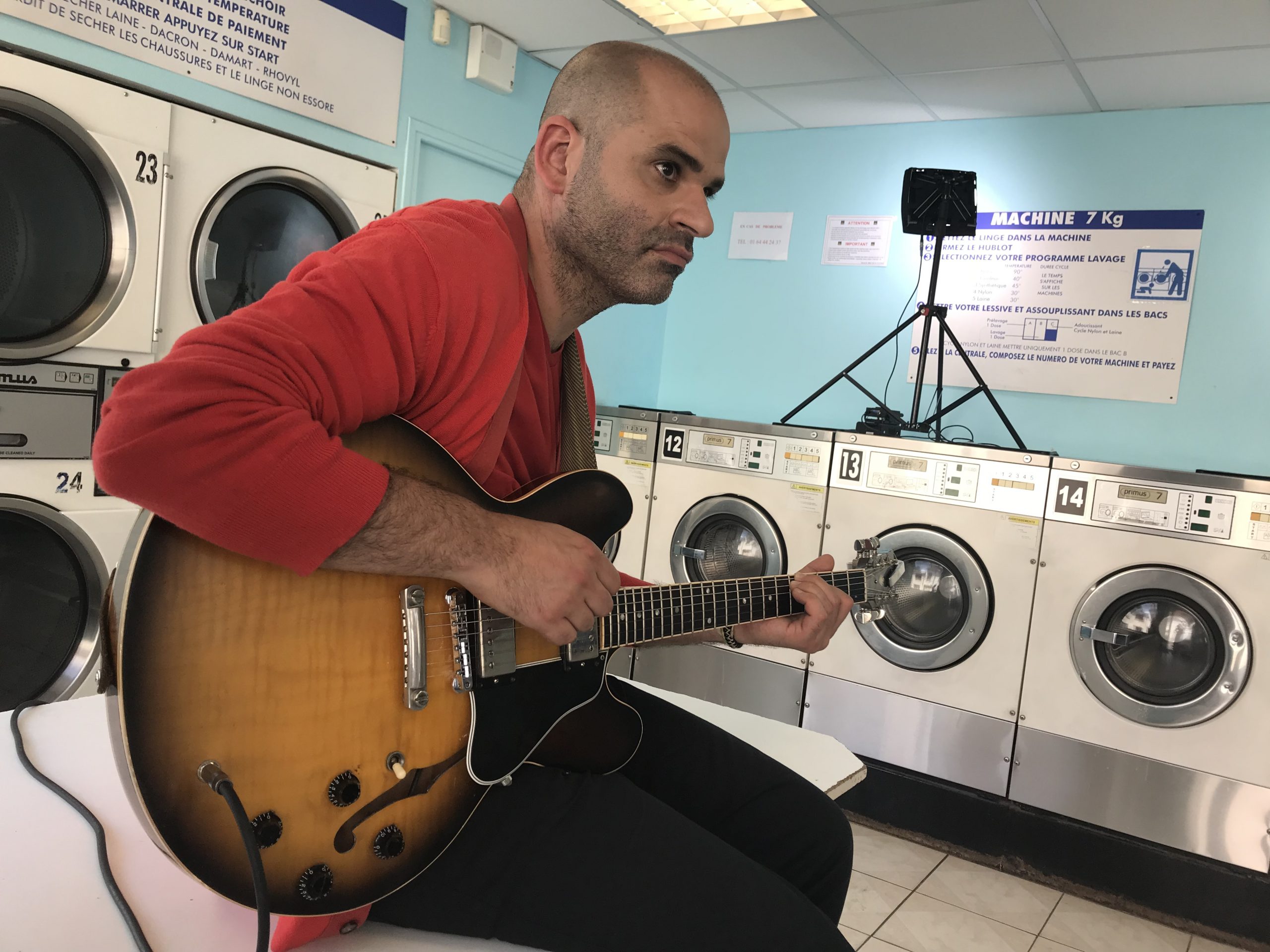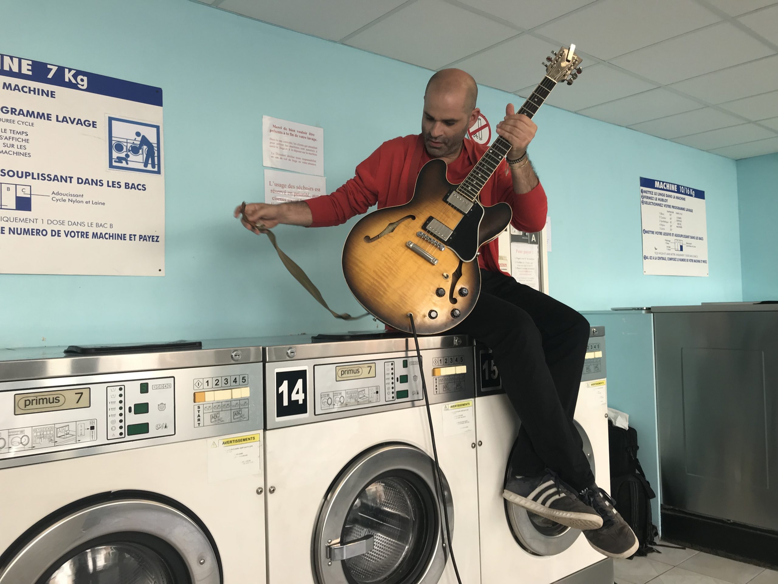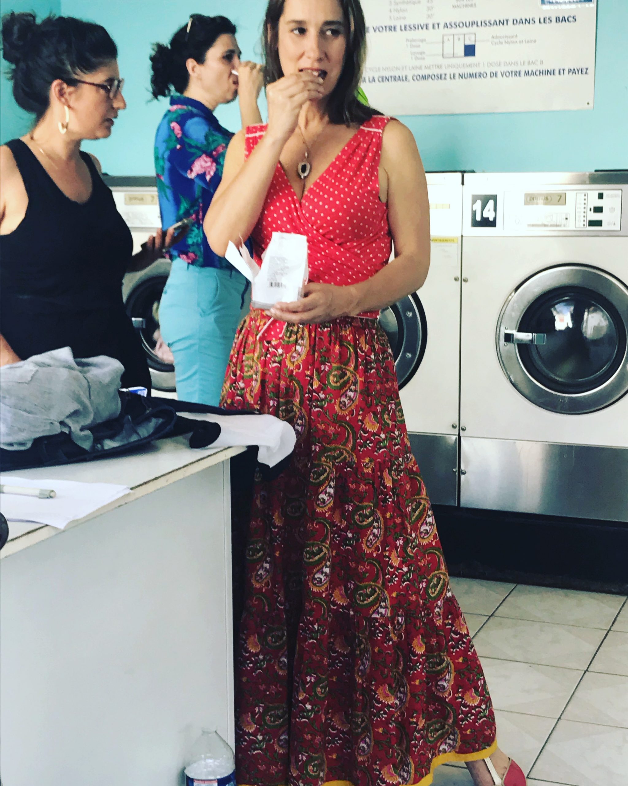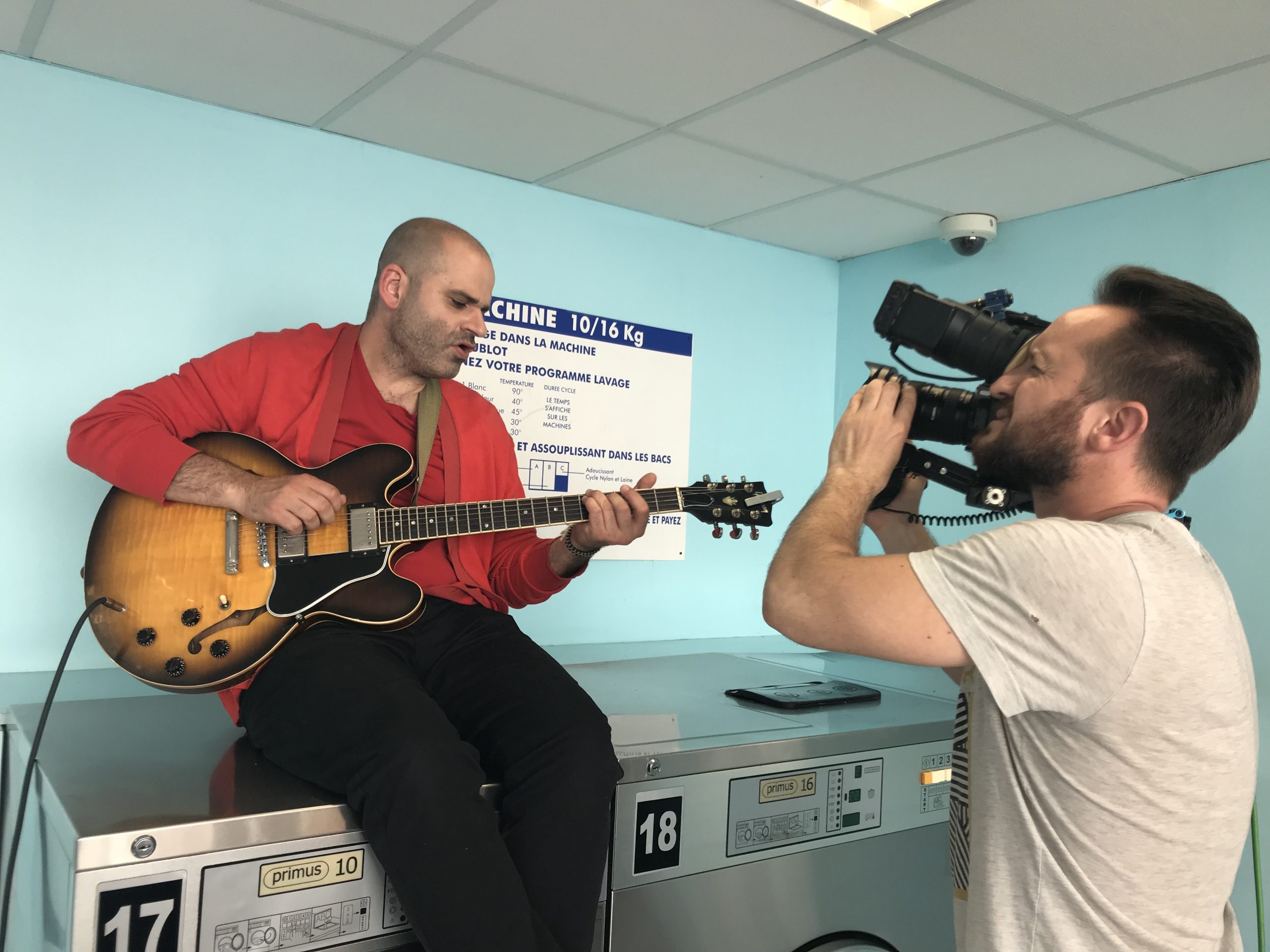 Deuxième partie de tournage ! Direction Villejuif. Banlieue parisienne. Sahra avait repéré un lovomatic qui lui plaisait. Les murs bleus turquoise, les sièges bleu roi, tous ces tambours qu’elle avait pour idée de faire tourner au même moment… On sèche on plie on range, mais avant il faut laver !!
